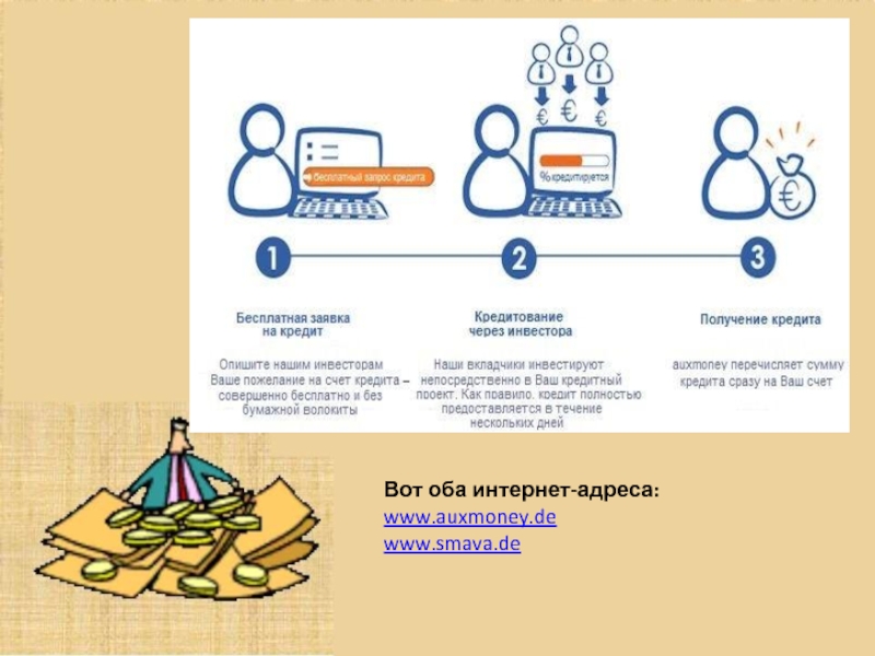 Зачастую кредит финансирует не одно частное лицо, а несколько инвесторов. Они скидываются для «кредитного проекта» и таким образом делят между собой риск (невыплату кредита) и проценты (прибыль). Это хорошая форма кредитования, которая не зависит от банка!
