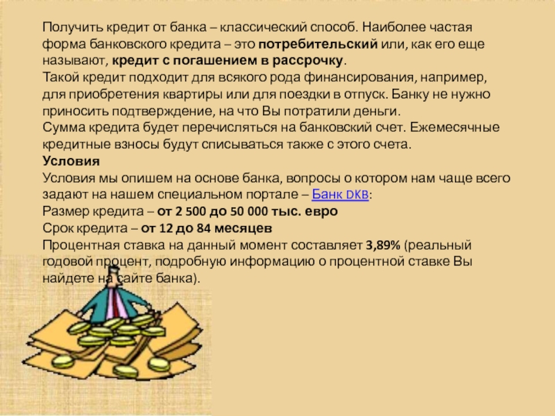 Слайд 21Получить кредит от банка – классический способ. Наиболее частая форма банковского