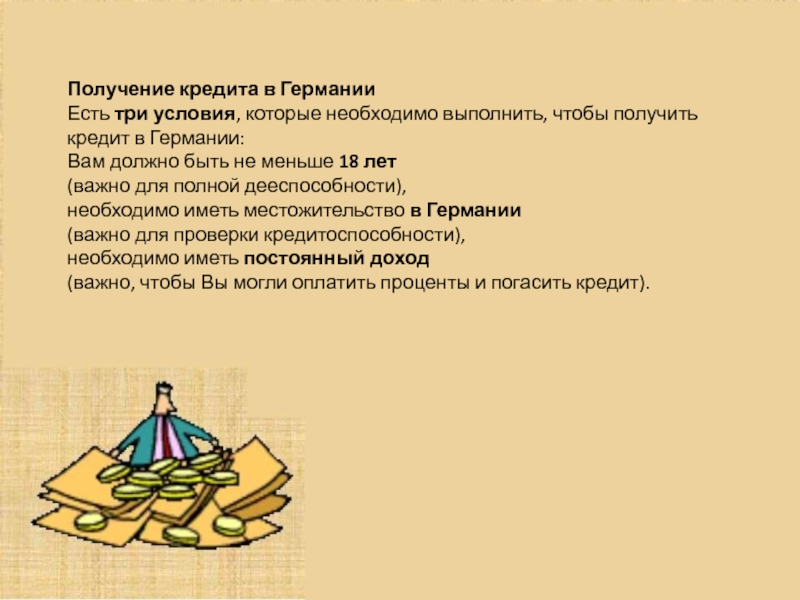 – кредит в рассрочку (Ratenkredit). В банке не нужно указывать назначение кредита. Этот вид кредита часто используется для того, чтобы купить вещи в квартиру или съездить в отпуск.