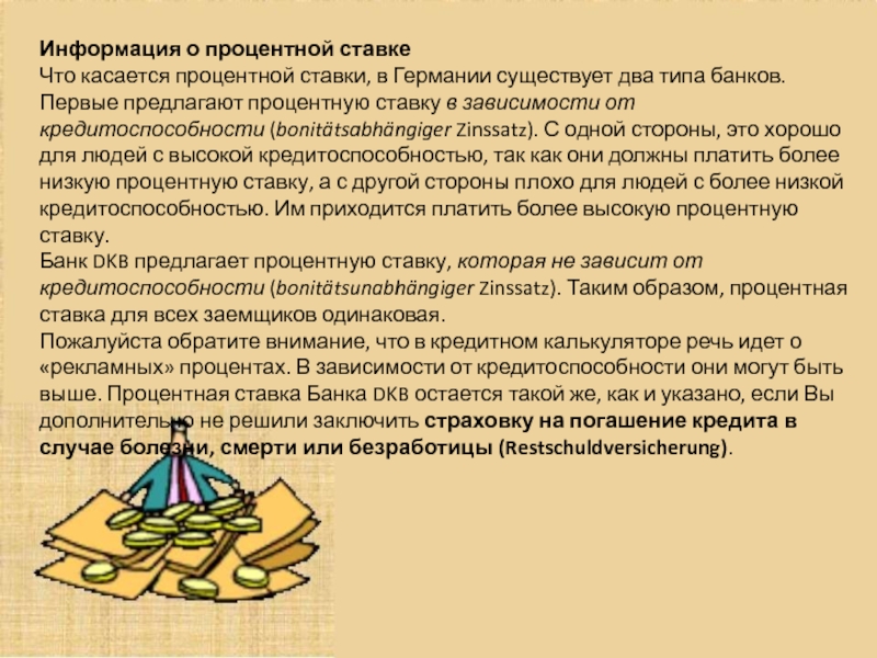типа банков. Первые предлагают процентную ставку в зависимости от кредитоспособности (bonitätsabhängiger Zinssatz). С одной стороны, это хорошо для людей с высокой кредитоспособностью, так как они должны платить более низкую процентную ставку, а с другой стороны плохо для людей с более низкой кредитоспособностью. Им приходится платить более высокую процентную ставку.