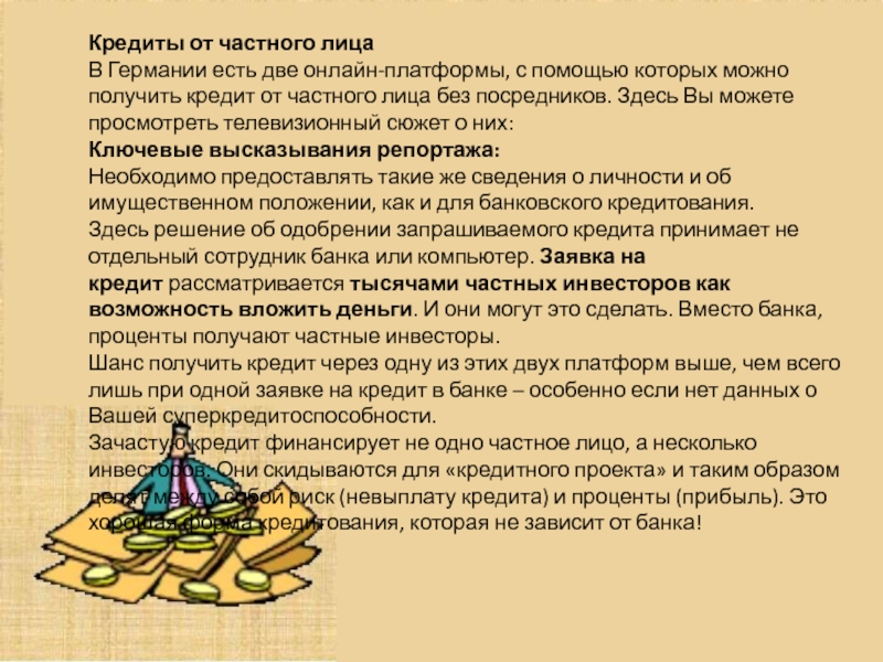 можно получить кредит от частного лица без посредников. Здесь Вы можете просмотреть телевизионный сюжет о них:
