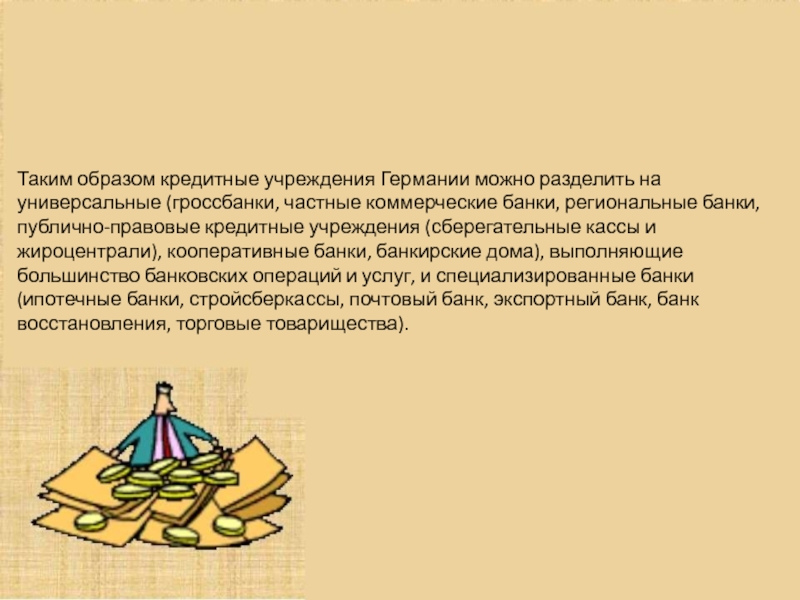 Слайд 19Таким образом кредитные учреждения Германии можно разделить на универсальные (гроссбанки, частные
