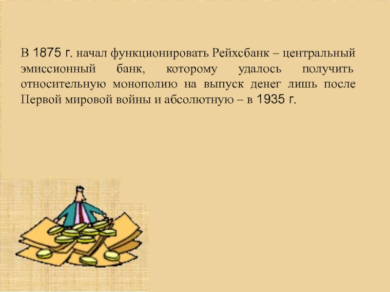 Слайд 6В 1875 г. начал функционировать Рейхсбанк – центральный эмиссионный банк, которому удалось