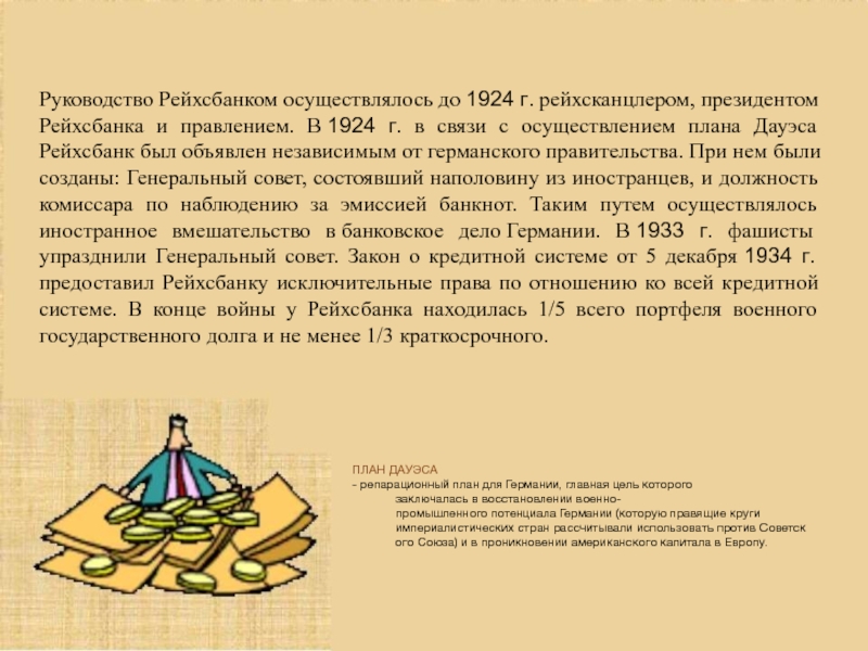 г. в связи с осуществлением плана Дауэса Рейхсбанк был объявлен независимым от германского правительства. При нем были созданы: Генеральный совет, состоявший наполовину из иностранцев, и должность комиссара по наблюдению за эмиссией банкнот. Таким путем осуществлялось иностранное вмешательство в банковское дело Германии. В 1933 г. фашисты упразднили Генеральный совет. Закон о кредитной системе от 5 декабря 1934 г. предоставил Рейхсбанку исключительные права по отношению ко всей кредитной системе. В конце войны у Рейхсбанка находилась 1/5 всего портфеля военного государственного долга и не менее 1/3 краткосрочного.