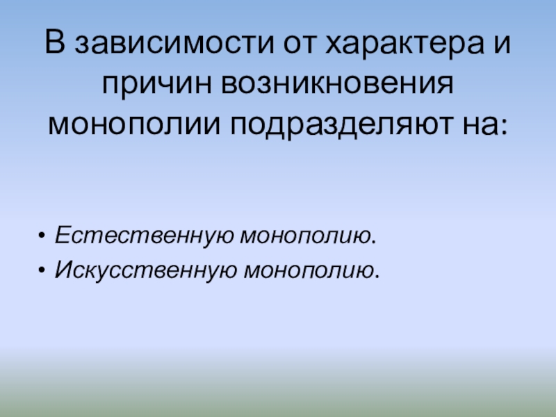Слайд 8В зависимости от характера и причин возникновения монополии подразделяют на: