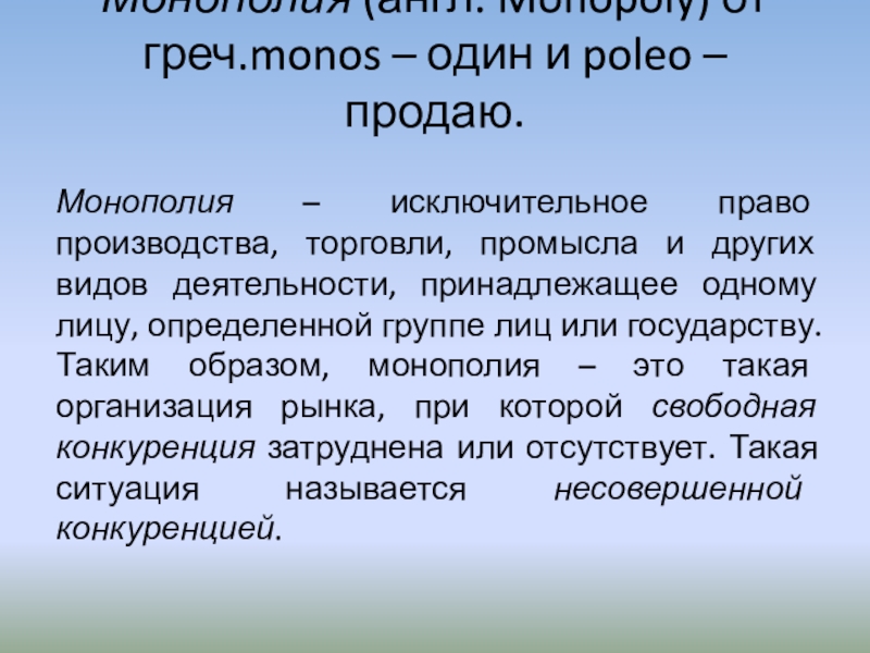 Слайд 3Монополия (англ. Monopoly) от греч.monos – один и poleo – продаю.