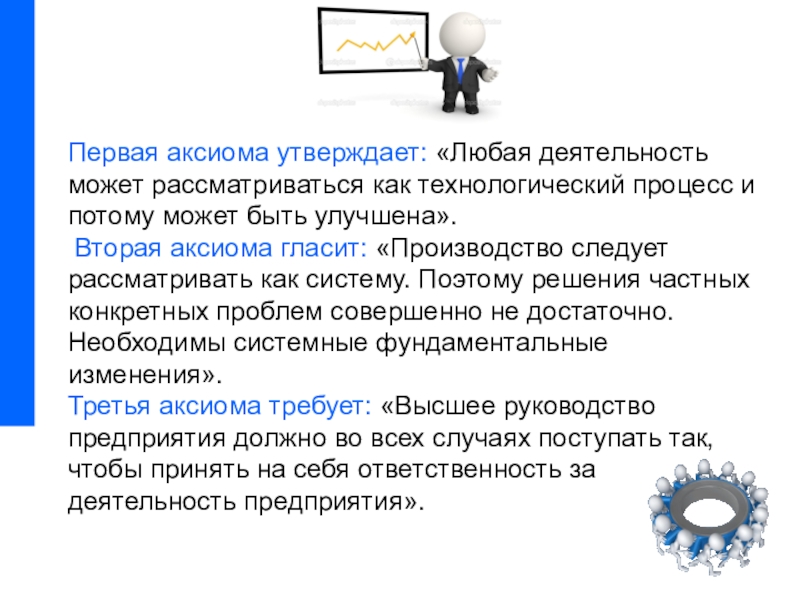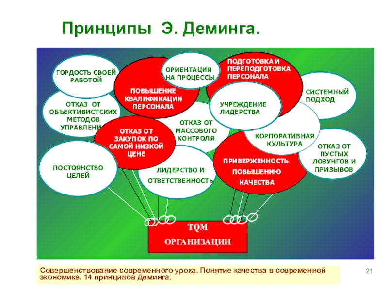 При правильном управлении каждый работающий получает удовлетворение от своей работы, он понимает, что от его работы зависит жизнь и благосостояние других людей, а сам он, в свою очередь, зависит от них. Этот принцип применим ко всем отраслям промышленности. Качество и жесткая конкуренция - неизбежное следствие правильной системы управления».