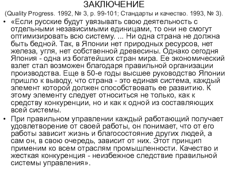 «Если русские будут увязывать свою деятельность с отдельными независимыми единицами, то они не смогут оптимизировать всю систему. ... Ни одна страна не должна быть бедной. Так, в Японии нет природных ресурсов, нет железа, угля, нет собственной древесины. Однако сегодня Япония - одна из богатейших стран мира. Ее экономический взлет стал возможен благодаря правильной организации производства. Еще в 50-е годы высшее руководство Японии пришло к выводу, что страна - это единая система, каждый элемент которой должен способствовать ее развитию. К этому элементу следует относиться не только, как к средству конкуренции, но и как к одной из составляющих всей системы.