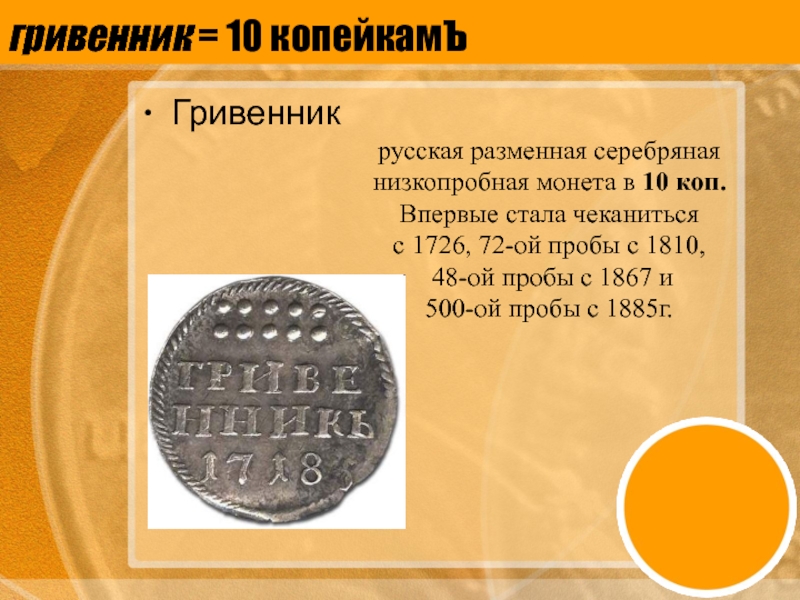 гривенник = 10 копейкамЪ Гривенникрусская разменная серебряная низкопробная монета в 10 коп. Впервые стала чеканиться с 1726,