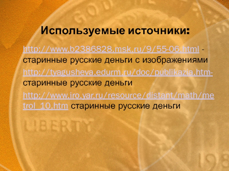 Используемые источники:http://www.b2386828.msk.ru/9/55-06.html - старинные русские деньги с изображениями http://tyagusheva.edurm.ru/doc/publikazia.htm- старинные русские деньги http://www.iro.yar.ru/resource/distant/math/metrol_10.htm старинные русские деньги