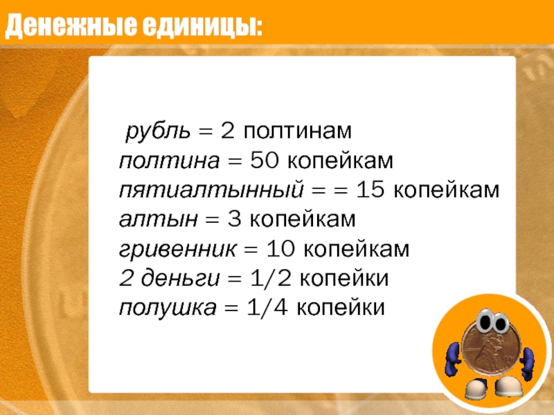 Денежные единицы:     рубль = 2 полтинам полтина = 50 копейкам пятиалтынный = =