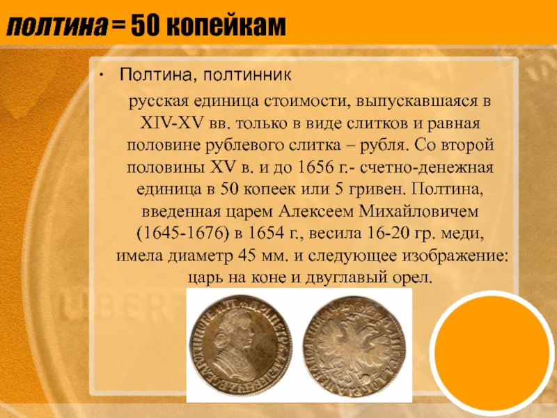 полтина = 50 копейкам Полтина, полтинникрусская единица стоимости, выпускавшаяся в XIV-XV вв. только в виде слитков и