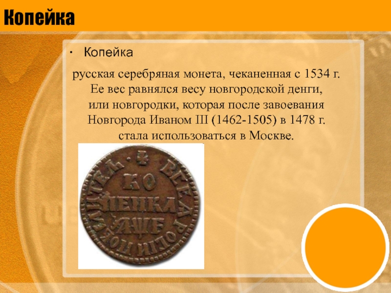 КопейкаКопейкарусская серебряная монета, чеканенная с 1534 г. Ее вес равнялся весу новгородской денги, или новгородки, которая после