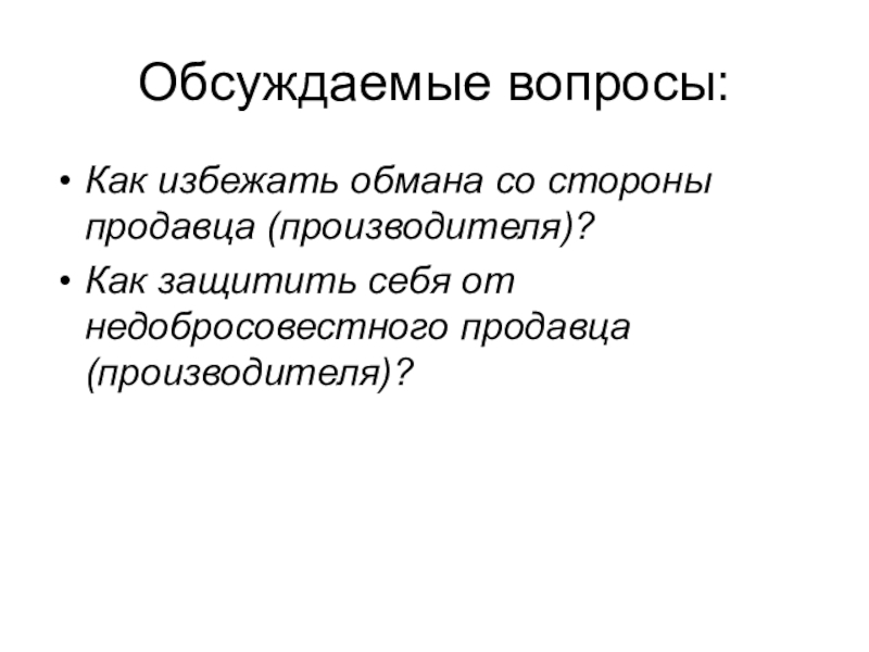 Обсуждаемые вопросы:Как избежать обмана со стороны продавца (производителя)?Как защитить себя от недобросовестного продавца (производителя)?