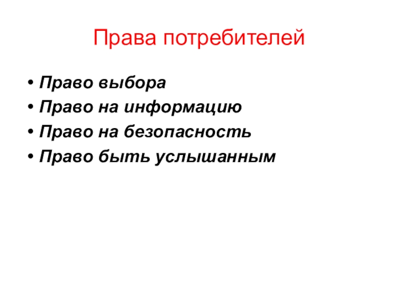 Права потребителейПраво выбораПраво на информациюПраво на безопасностьПраво быть услышанным