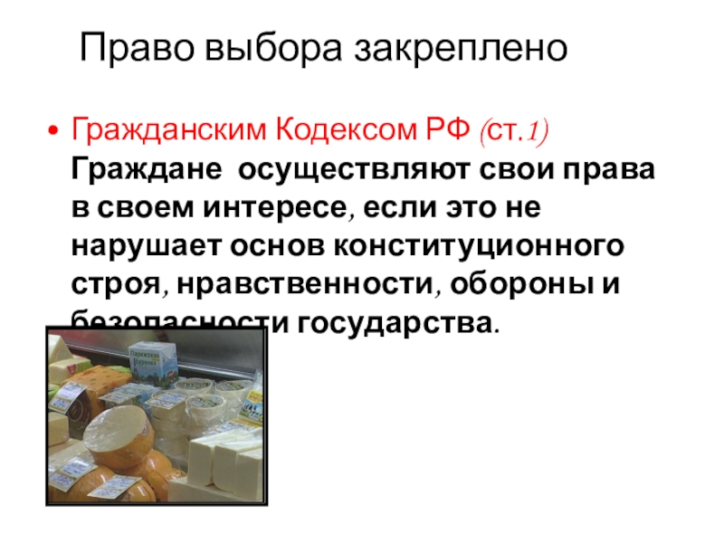 Право выбора закреплено Гражданским Кодексом РФ (ст.1)       Граждане осуществляют свои