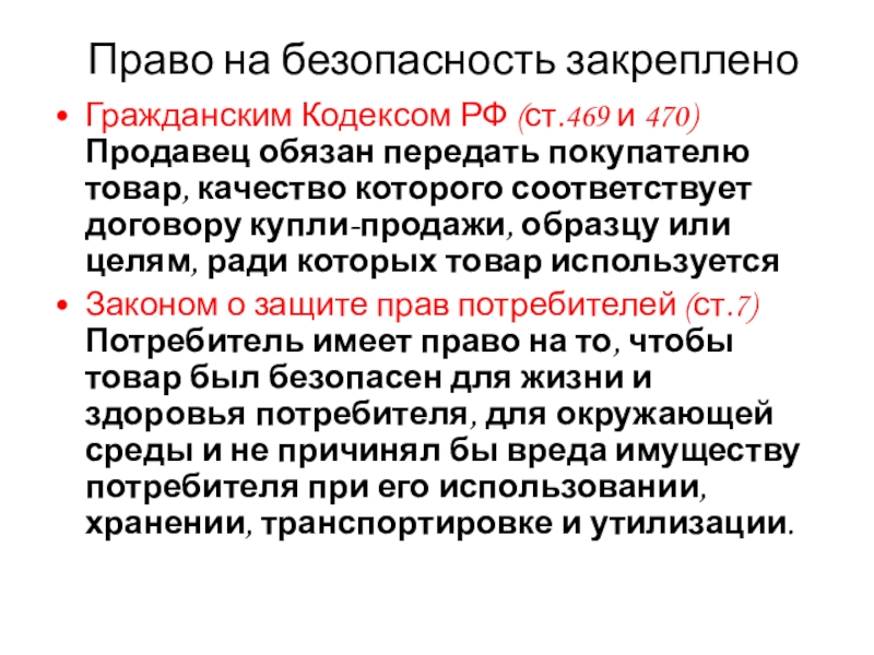 Право на безопасность закрепленоГражданским Кодексом РФ (ст.469 и 470)      Продавец обязан