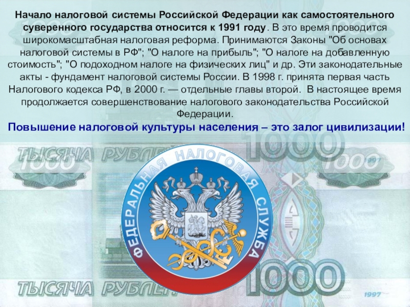 Слайд 2Налоговая система современной России отсчитывает свою историю с 1991 года. Однако