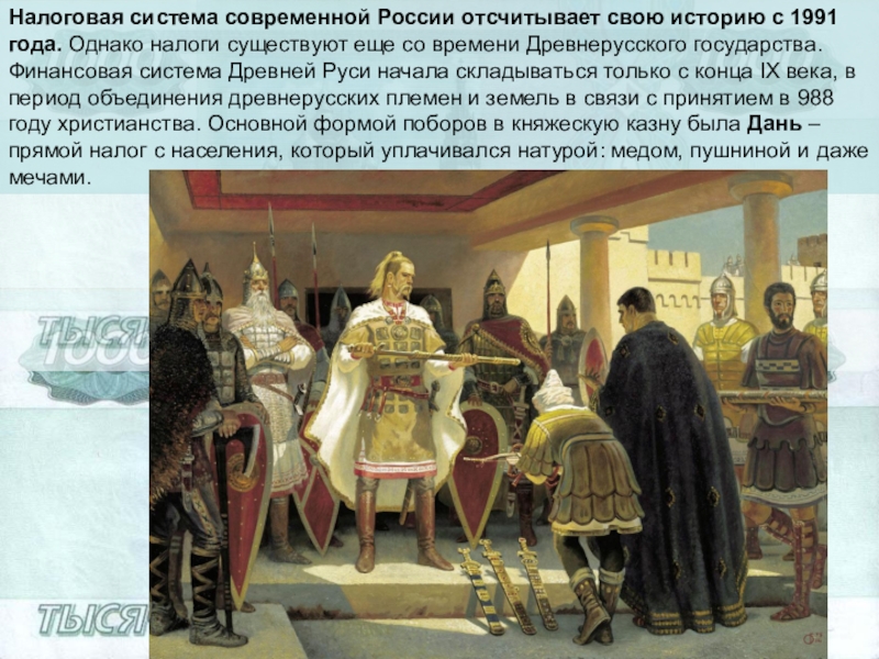 налоги существуют еще со времени Древнерусского государства. Финансовая система Древней Руси начала складываться только с конца IX века, в период объединения древнерусских племен и земель в связи с принятием в 988 году христианства. Основной формой поборов в княжескую казну была Дань – прямой налог с населения, который уплачивался натурой: медом, пушниной и даже мечами.