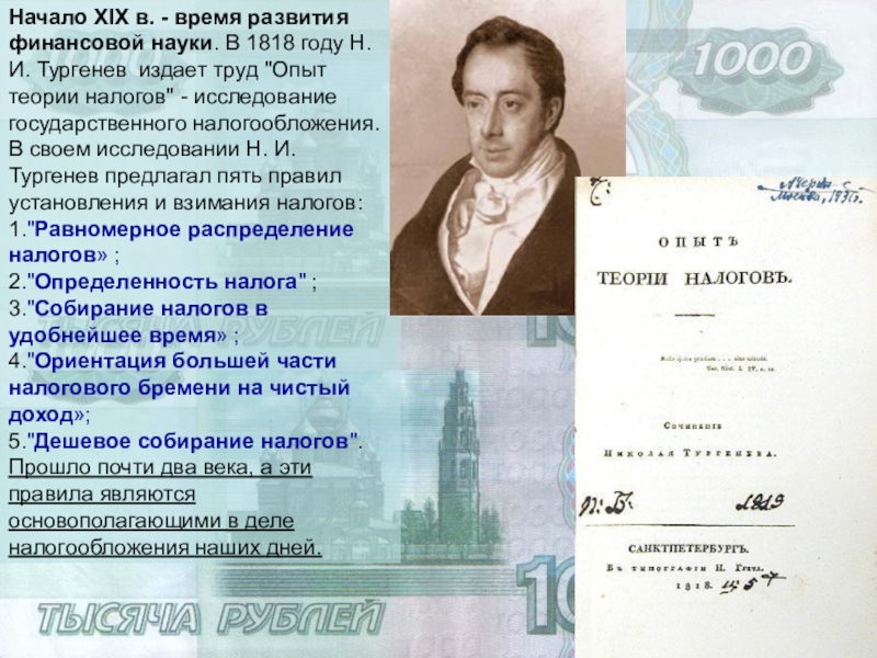 Н. И. Тургенев издает труд "Опыт теории налогов" - исследование государственного налогообложения. В своем исследовании Н. И. Тургенев предлагал пять правил установления и взимания налогов: