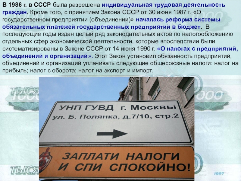 Слайд 16В 1986 г. в СССР была разрешена индивидуальная трудовая деятельность граждан. Кроме