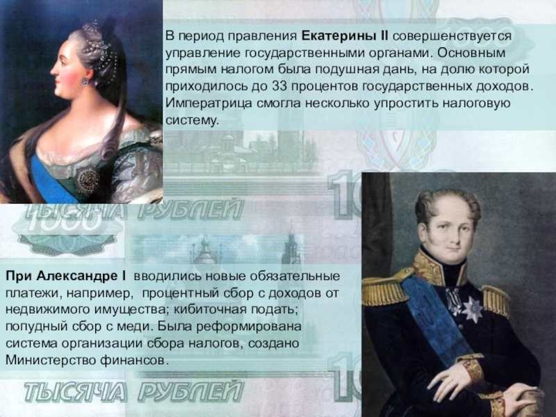 При Александре I вводились новые обязательные платежи, например, процентный сбор с доходов от недвижимого имущества; кибиточная подать; попудный сбор с меди. Была реформирована система организации сбора налогов, создано Министерство финансов.