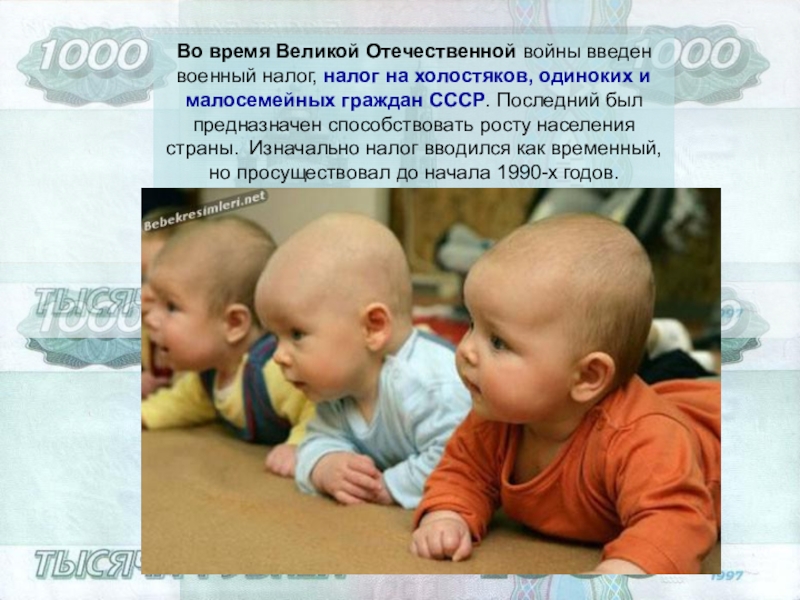 Слайд 14Во время Великой Отечественной войны введен военный налог, налог на холостяков,