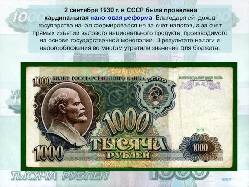 Слайд 13 2 сентября 1930 г. в СССР была проведена кардинальная налоговая реформа. Благодаря