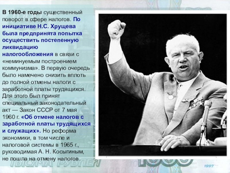 Слайд 15В 1960-е годы существенный поворот в сфере налогов. По инициативе Н.С.