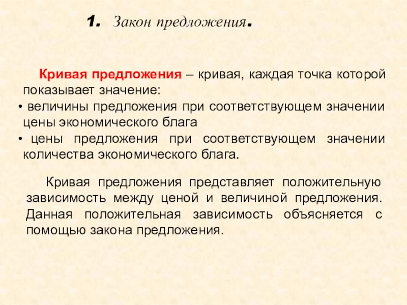 Кривая предложения представляет положительную зависимость между ценой и величиной предложения. Данная положительная зависимость объясняется с помощью закона предложения.