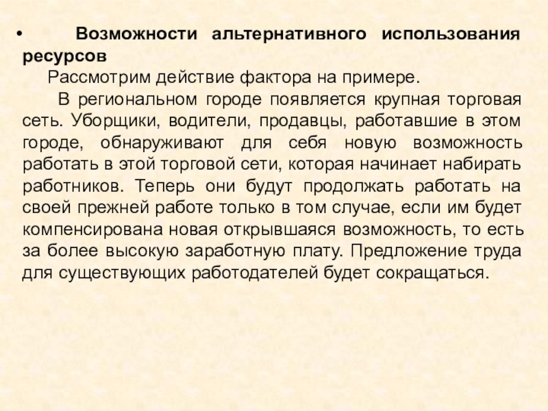 В региональном городе появляется крупная торговая сеть. Уборщики, водители, продавцы, работавшие в этом городе, обнаруживают для себя новую возможность работать в этой торговой сети, которая начинает набирать работников. Теперь они будут продолжать работать на своей прежней работе только в том случае, если им будет компенсирована новая открывшаяся возможность, то есть за более высокую заработную плату. Предложение труда для существующих работодателей будет сокращаться.