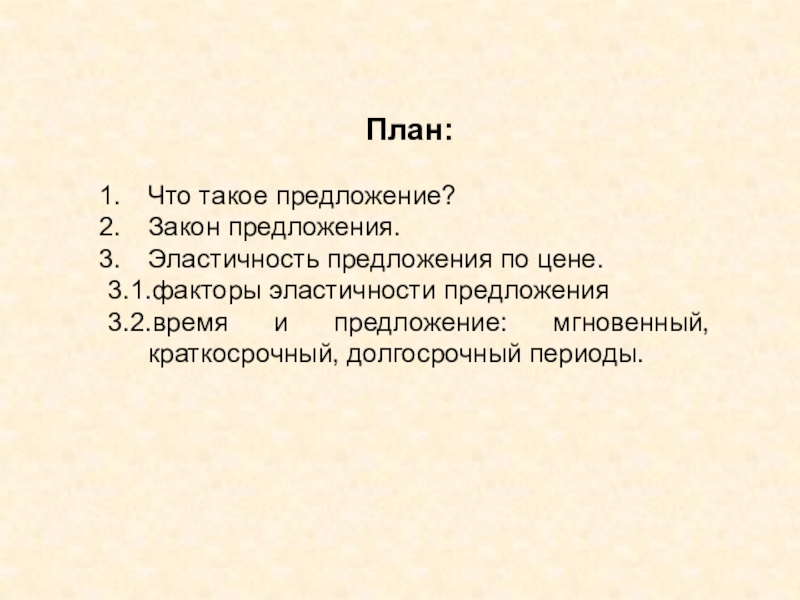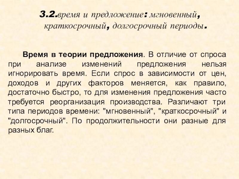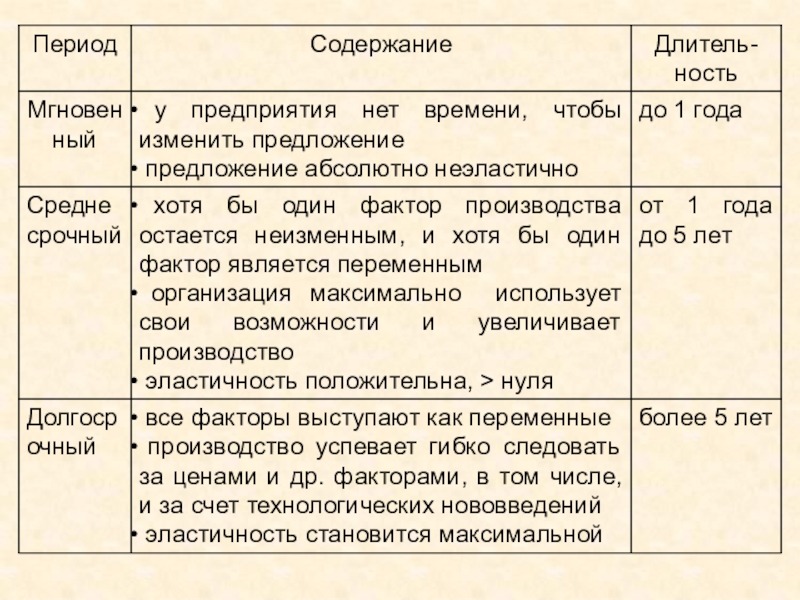 при анализе изменений предложения нельзя игнорировать время. Если спрос в зависимости от цен, доходов и других факторов меняется, как правило, достаточно быстро, то для изменения предложения часто требуется реорганизация производства. Различают три типа периодов времени: "мгновенный", "краткосрочный" и "долгосрочный". По продолжительности они разные для разных благ.