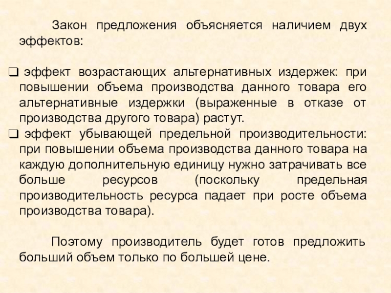 Слайд 10 Закон предложения объясняется наличием двух эффектов: