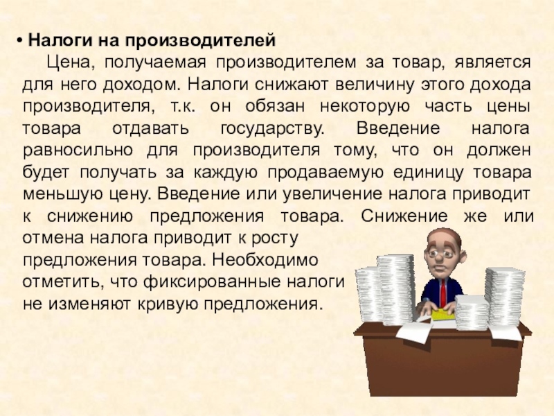 для него доходом. Налоги снижают величину этого дохода производителя, т.к. он обязан некоторую часть цены товара отдавать государству. Введение налога равносильно для производителя тому, что он должен будет получать за каждую продаваемую единицу товара меньшую цену. Введение или увеличение налога приводит к снижению предложения товара. Снижение же или отмена налога приводит к росту