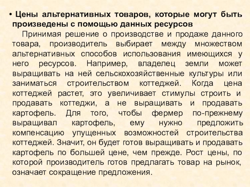 Принимая решение о производстве и продаже данного товара, производитель выбирает между множеством альтернативных способов использования имеющихся у него ресурсов. Например, владелец земли может выращивать на ней сельскохозяйственные культуры или заниматься строительством коттеджей. Когда цена коттеджей растет, это увеличивает стимулы строить и продавать коттеджи, а не выращивать и продавать картофель. Для того, чтобы фермер по-прежнему выращивал картофель, ему нужно предложить компенсацию упущенных возможностей строительства коттеджей. Значит, он будет готов выращивать и продавать картофель по большей цене, чем прежде. Рост цены, по которой производитель готов предлагать товар на рынок, означает сокращение предложения.