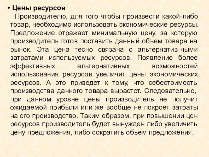 использовать экономические ресурсы. Предложение отражает минимальную цену, за которую производитель готов поставить данный объем товара на рынок. Эта цена тесно связана с альтернатив-ными затратами используемых ресурсов. Появление более эффективных альтернативных возможностей использования ресурсов увеличит цены экономических ресурсов. А это приведет к тому, что себестоимость производства данного товара вырастет. Следовательно, при данном уровне цены производитель не получит ожидаемой прибыли или же вообще не покроет затраты на его производство. Таким образом, при повышении цен ресурсов производитель будет вынужден либо увеличить цену предложения, либо сократить объем предложения.