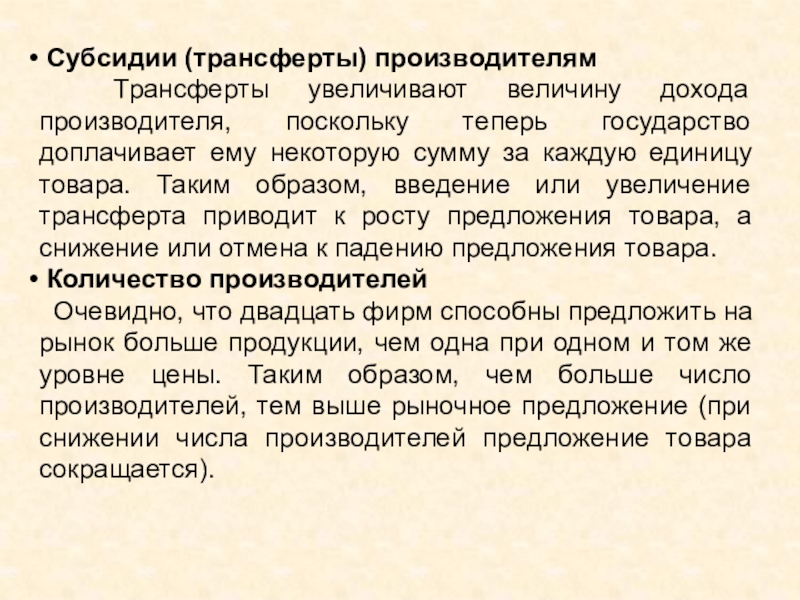 государство доплачивает ему некоторую сумму за каждую единицу товара. Таким образом, введение или увеличение трансферта приводит к росту предложения товара, а снижение или отмена к падению предложения товара.