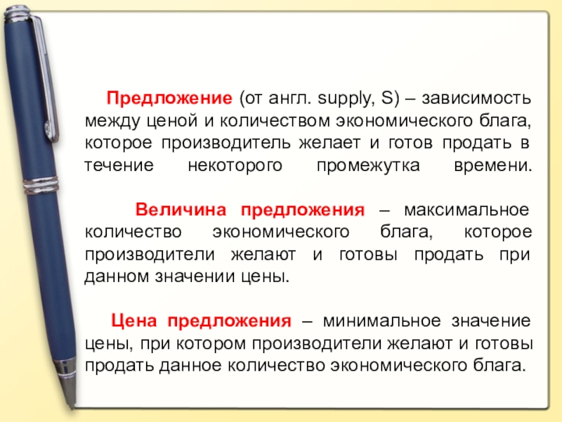 и количеством экономического блага, которое производитель желает и готов продать в течение некоторого промежутка времени.