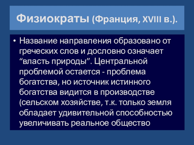 означает “власть природы”. Центральной проблемой остается - проблема богатства, но источник истинного богатства видится в производстве (сельском хозяйстве, т.к. только земля обладает удивительной способностью увеличивать реальное общество