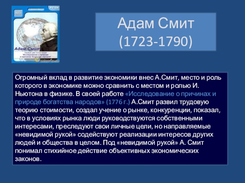 которого в экономике можно сравнить с местом и ролью И.Ньютона в физике. В своей работе «Исследование о причинах и природе богатства народов» (1776 г.) А.Смит развил трудовую теорию стоимости, создал учение о рынке, конкуренции, показал, что в условиях рынка люди руководствуются собственными интересами, преследуют свои личные цели, но направляемые «невидимой рукой» содействуют реализации интересов других людей и общества в целом. Под «невидимой рукой» А. Смит понимал стихийное действие объективных экономических законов.