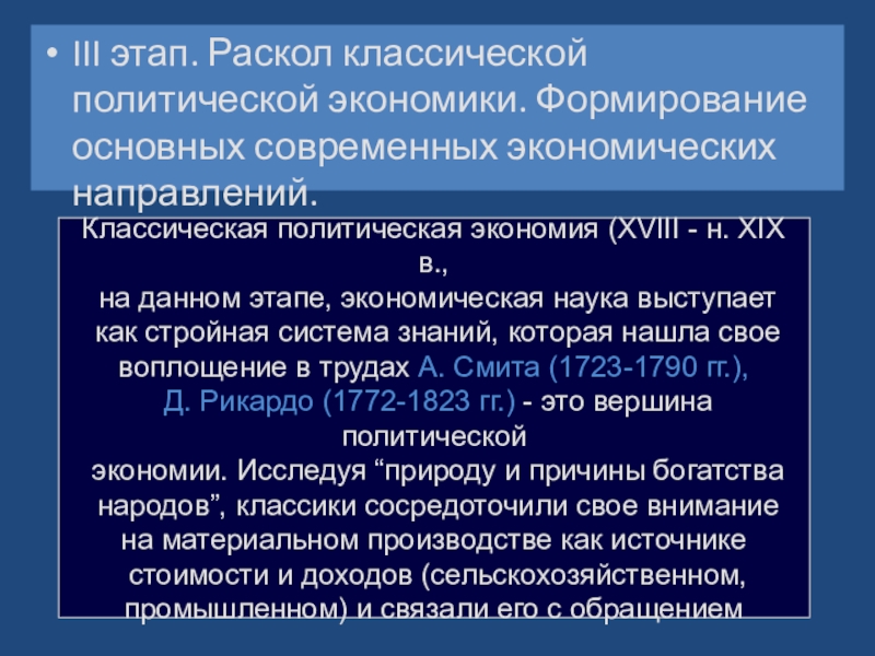 Слайд 8III этап. Раскол классической политической экономики. Формирование основных современных экономических направлений.
