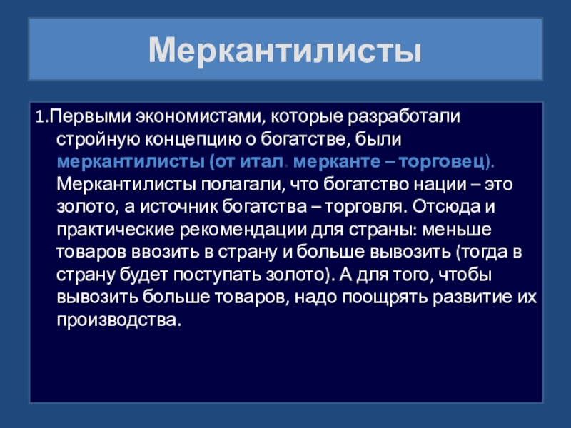 1.Первыми экономистами, которые разработали стройную концепцию о богатстве, были меркантилисты (от