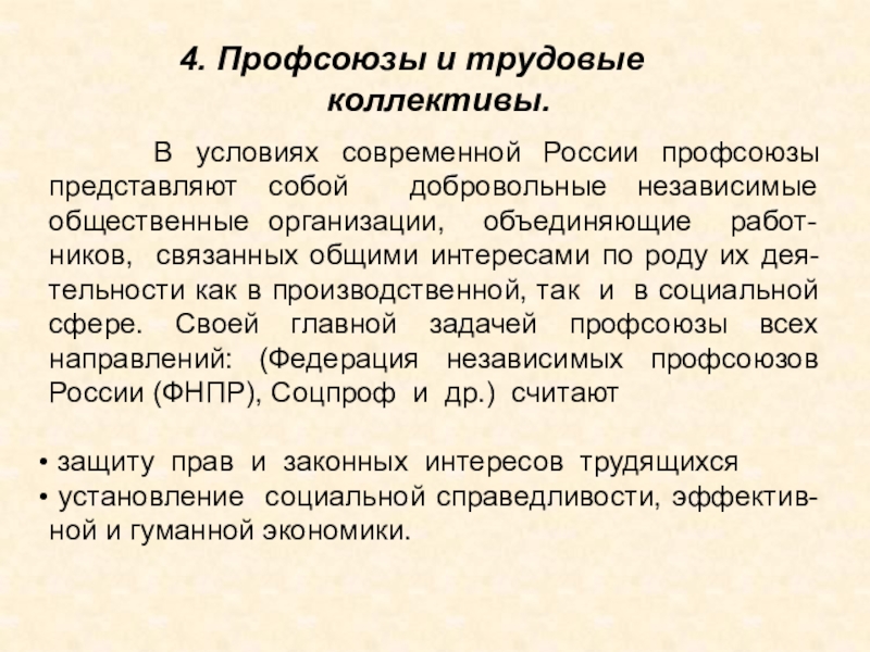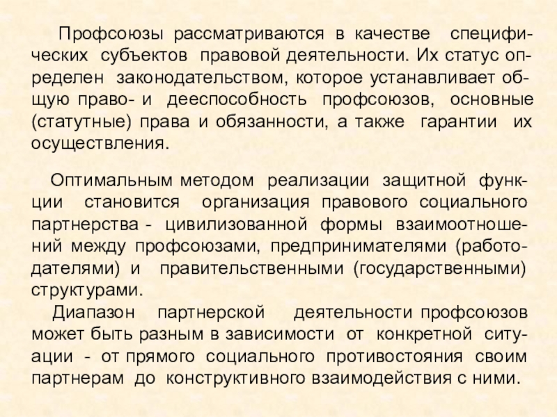 Диапазон партнерской деятельности профсоюзов может быть разным в зависимости от конкретной ситу-ации - от прямого социального противостояния своим партнерам до конструктивного взаимодействия с ними.