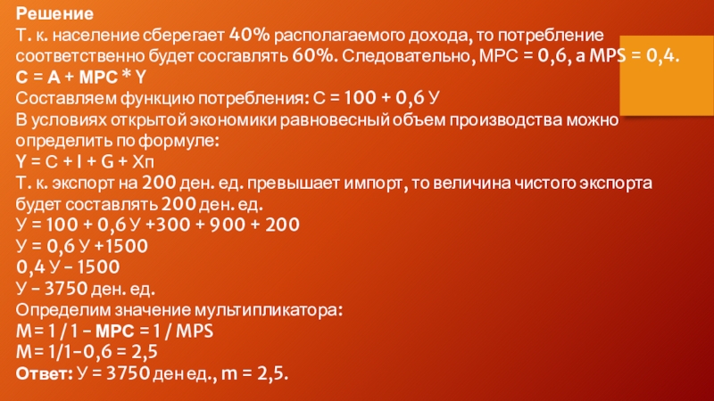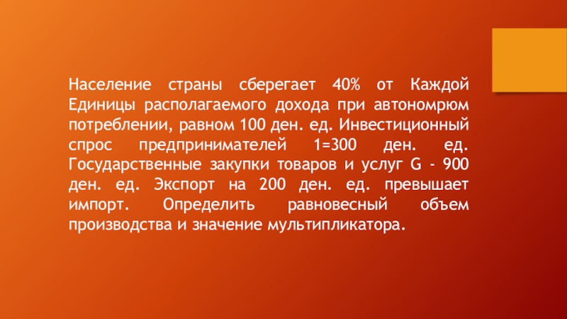 Слайд 12Население страны сберегает 40% от Каждой Единицы располагаемого дохода при автономрюм