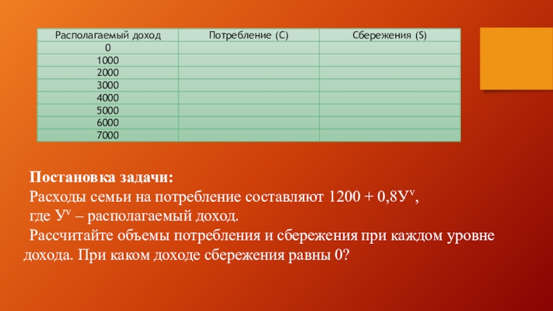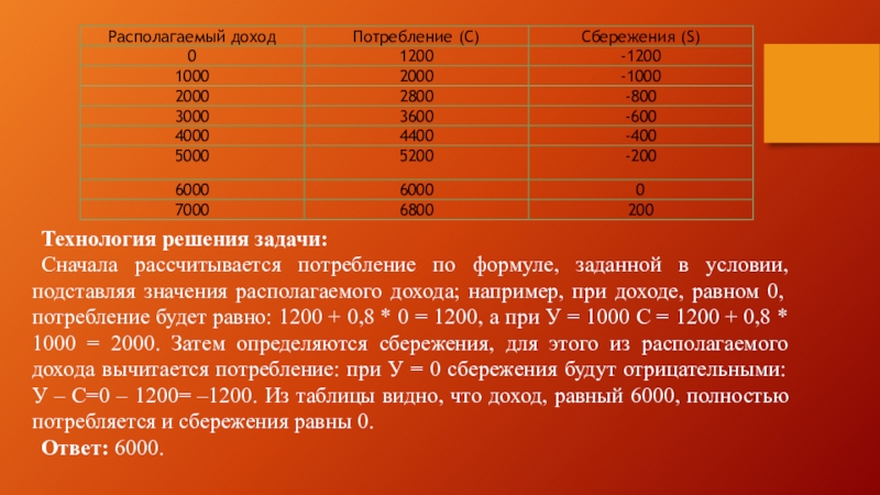 Рассчитайте объемы потребления и сбережения при каждом уровне дохода. При каком доходе сбережения равны 0?