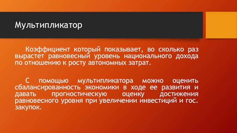 С помощью мультипликатора можно оценить сбалансированность экономики в ходе ее развития и давать прогностическую оценку достижения равновесного уровня при увеличении инвестиций и гос. закупок.