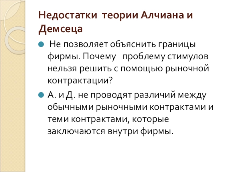 Слайд 15Недостатки теории Алчиана и Демсеца