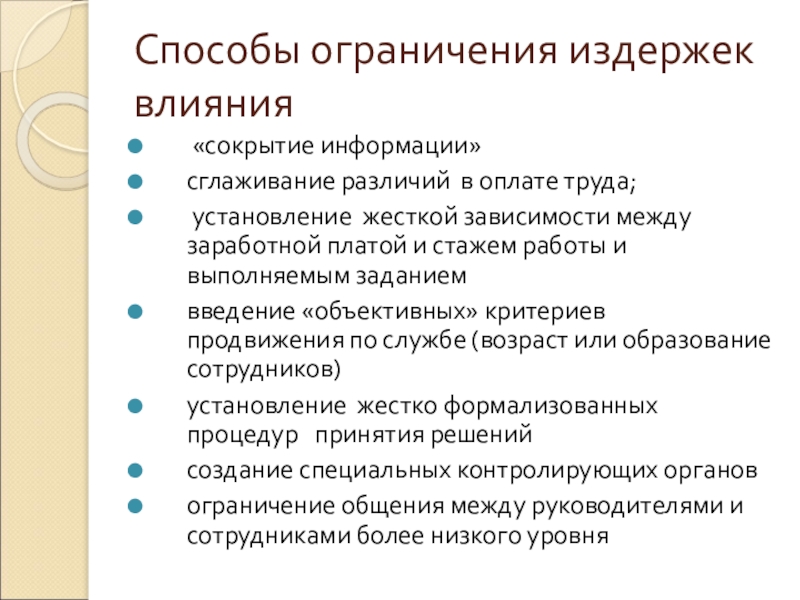 Слайд 26Способы ограничения издержек влияния