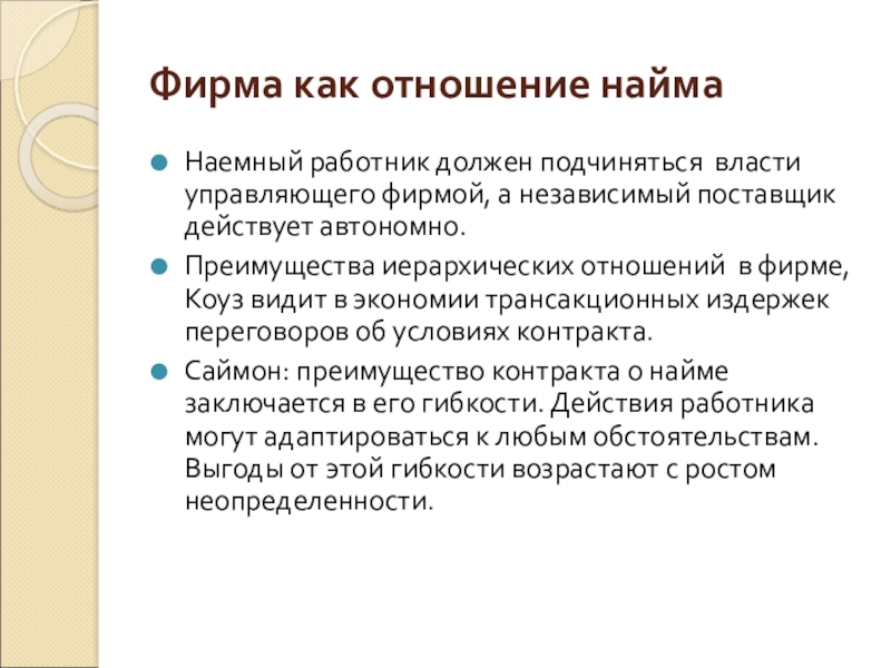 Фирма как отношения найма: Коуз 1937 г. , Саймон 1951