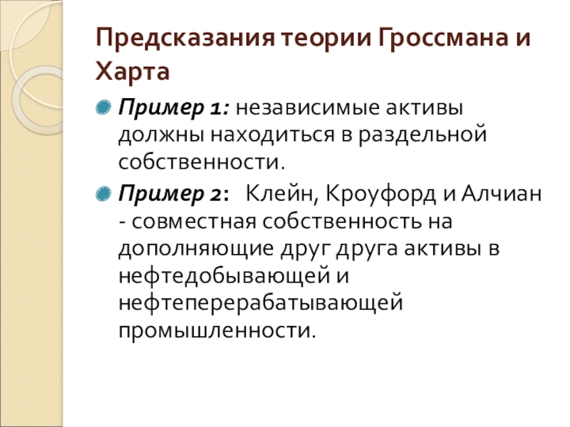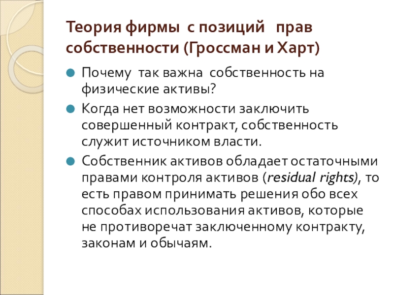 теории фирмы, что позволяет делать предсказания относительно структуры прав собственности в фирме в зависимости от характеристик активов